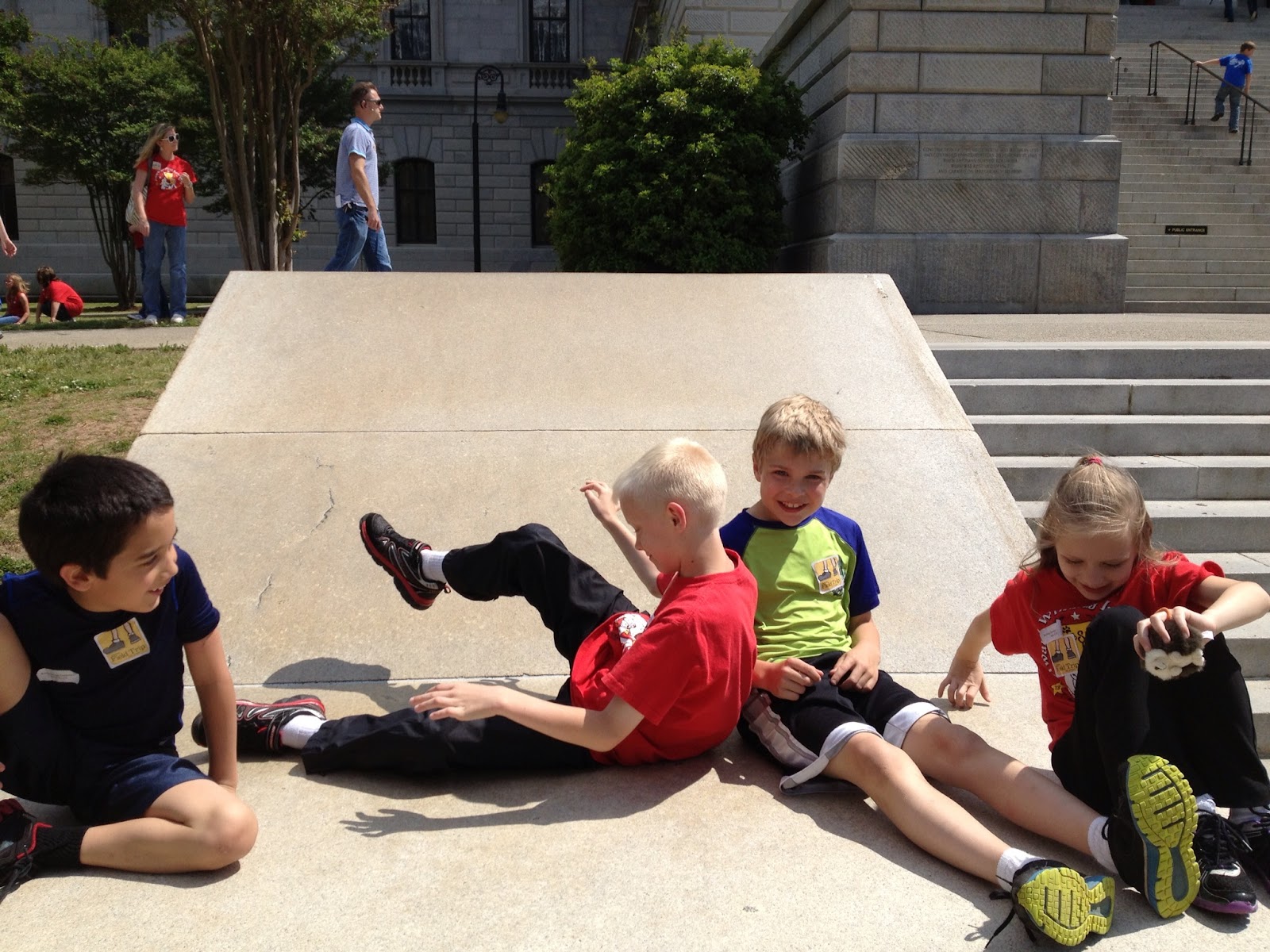 Then the last place we went was to the state house grounds. We weren't able to go inside, but the kids had fun walking up the huge steps and making a slide out of a slanted concrete slab.